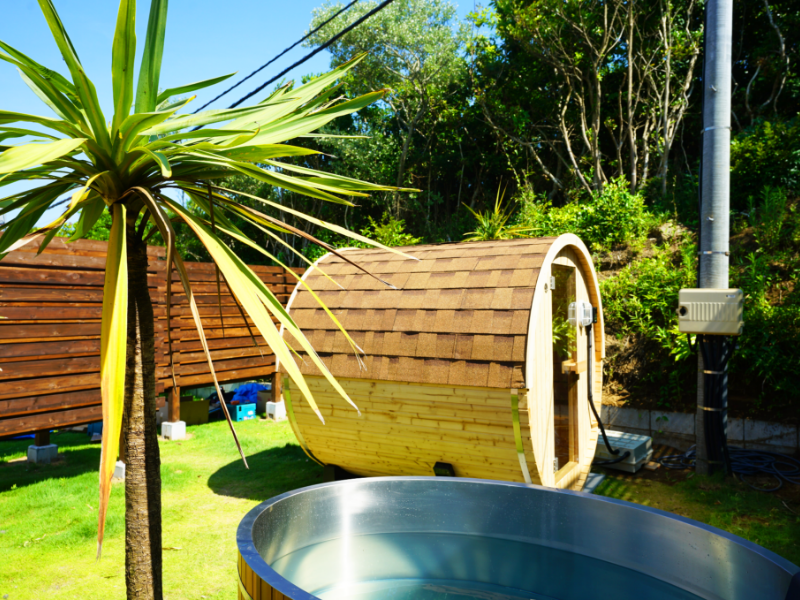 ツインドームテントにご宿泊の方はバレルサウナがご利用いただけます。サウナ室の温度は約90℃に設定しており、本格仕様です!
