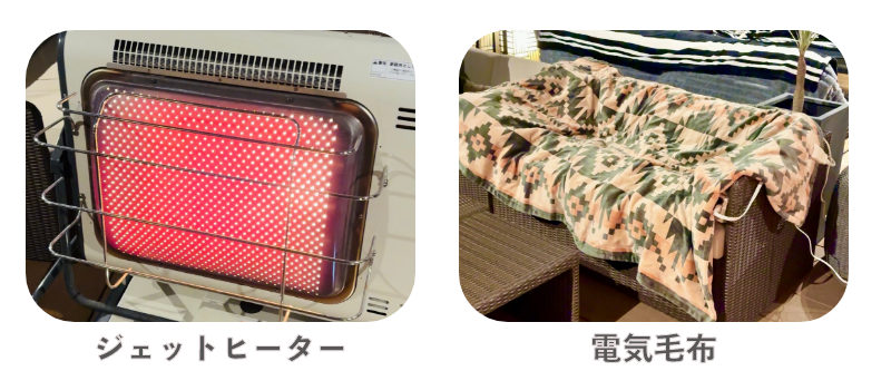 大型のジェットヒーターが空間全体をぽかぽかに暖め、さらにソファ席には電気毛布も完備しています。