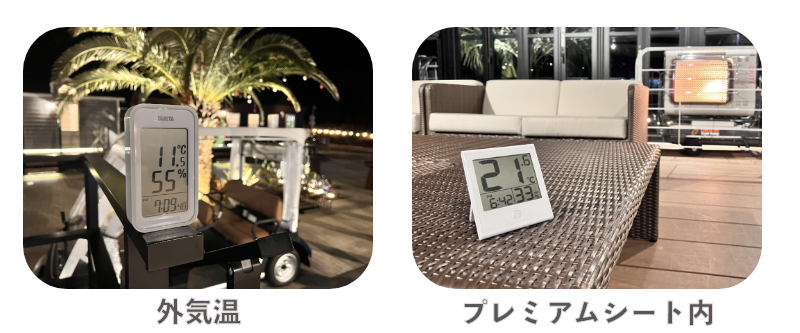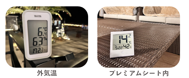 • 寒波で外が6℃だった日でも、シート内は14℃まで上昇!