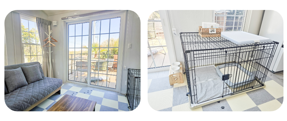 また、お部屋内にはわんちゃん専用のケージもご用意しておりますので、安心してお過ごしいただけます。