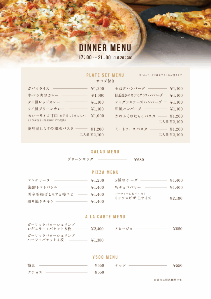 ディナー営業時間 : 17: 00~ 21:00 (L.O.20:30)
