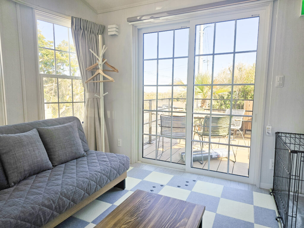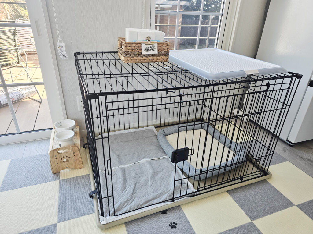 お部屋内にはわんちゃん専用のケージもご用意しておりますので、安心してお過ごしいただけます。※ロフトおよびベッドルームは、わんちゃんの立ち入りをご遠慮いただいております。あらかじめご了承ください。