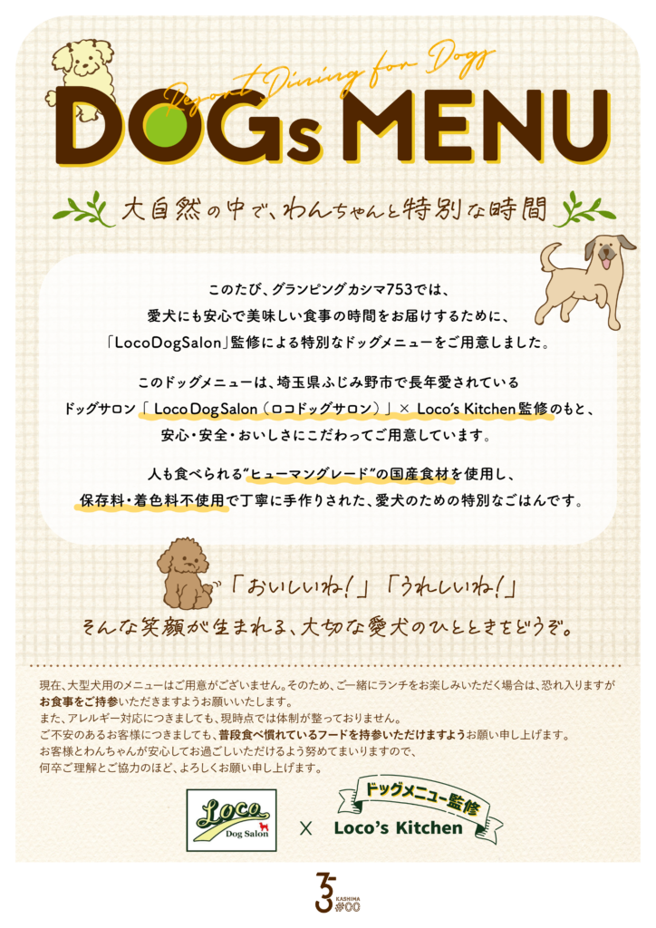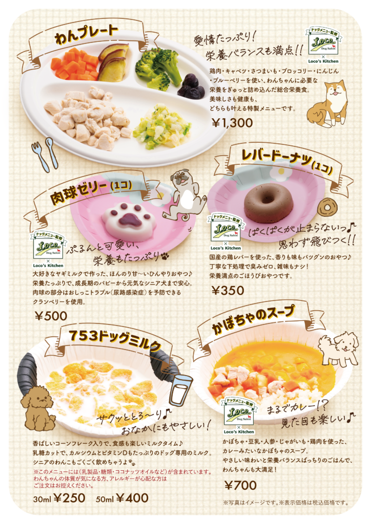 わんちゃん用のお食事はお持ち込み可能なほか、当施設内の「ドッグカフェ753」で販売しているメニューもご注文いただけます。
